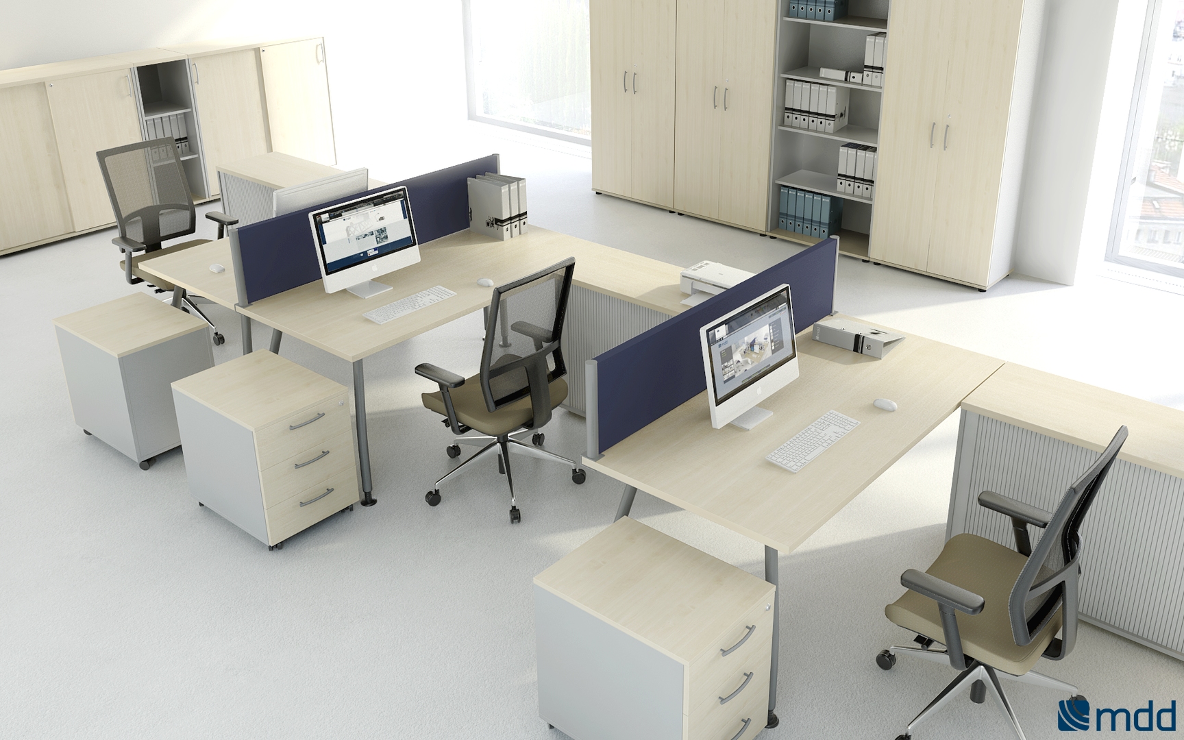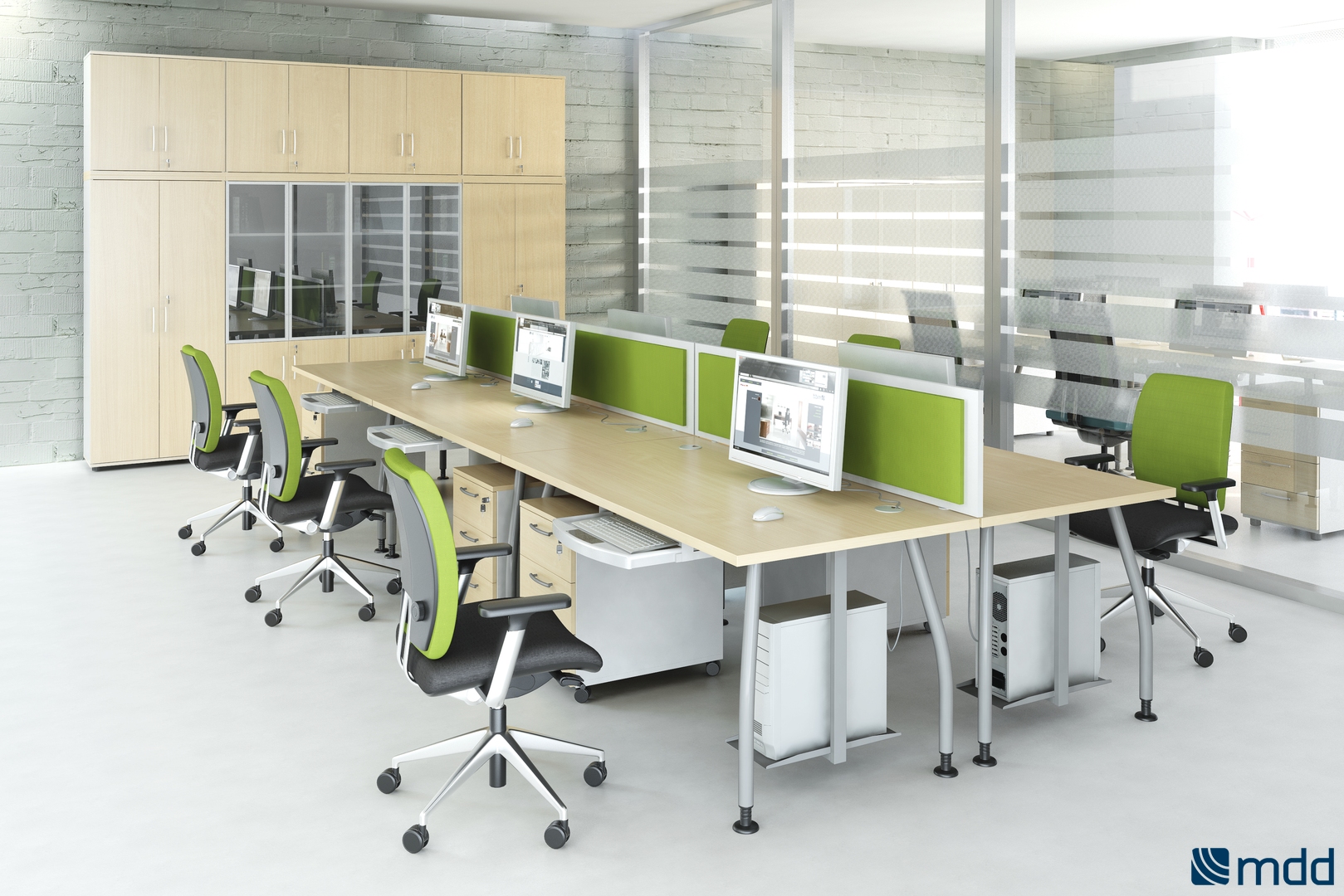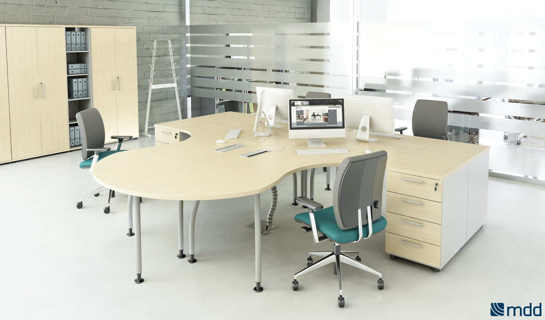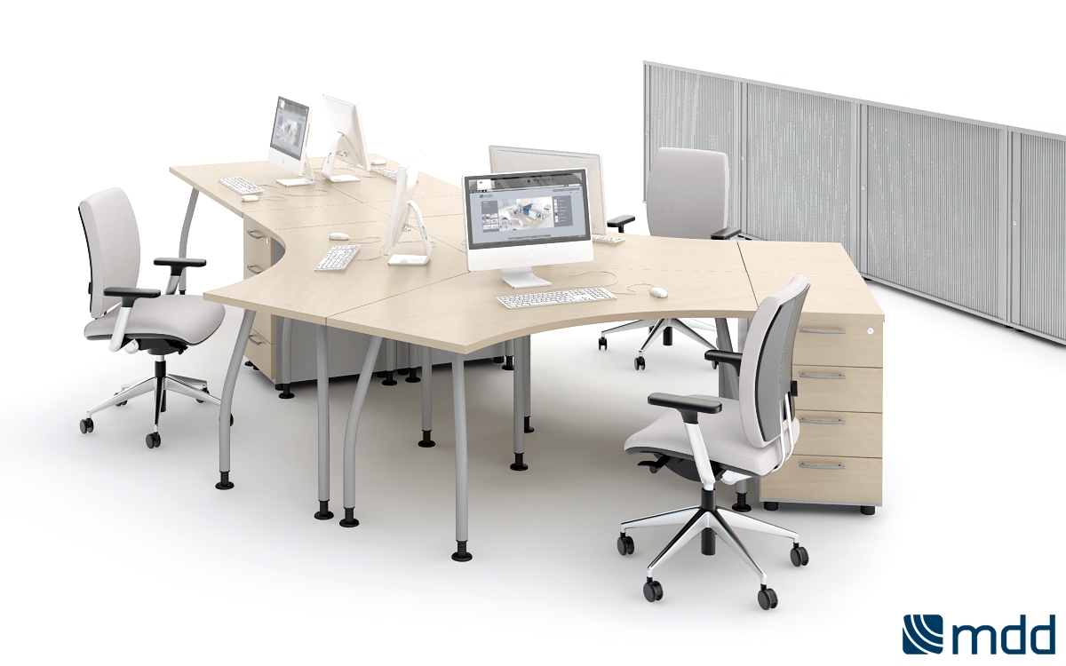 Meble biurowe MDD ALFA to system mebli pracowniczych oparty o lekko wygiętą nogę w kolorze aluminium lub antracytu. Lekka konstrukcja, szeroka gama biurek daje bardzo szerokie możliwości aranżacyjne biur.
