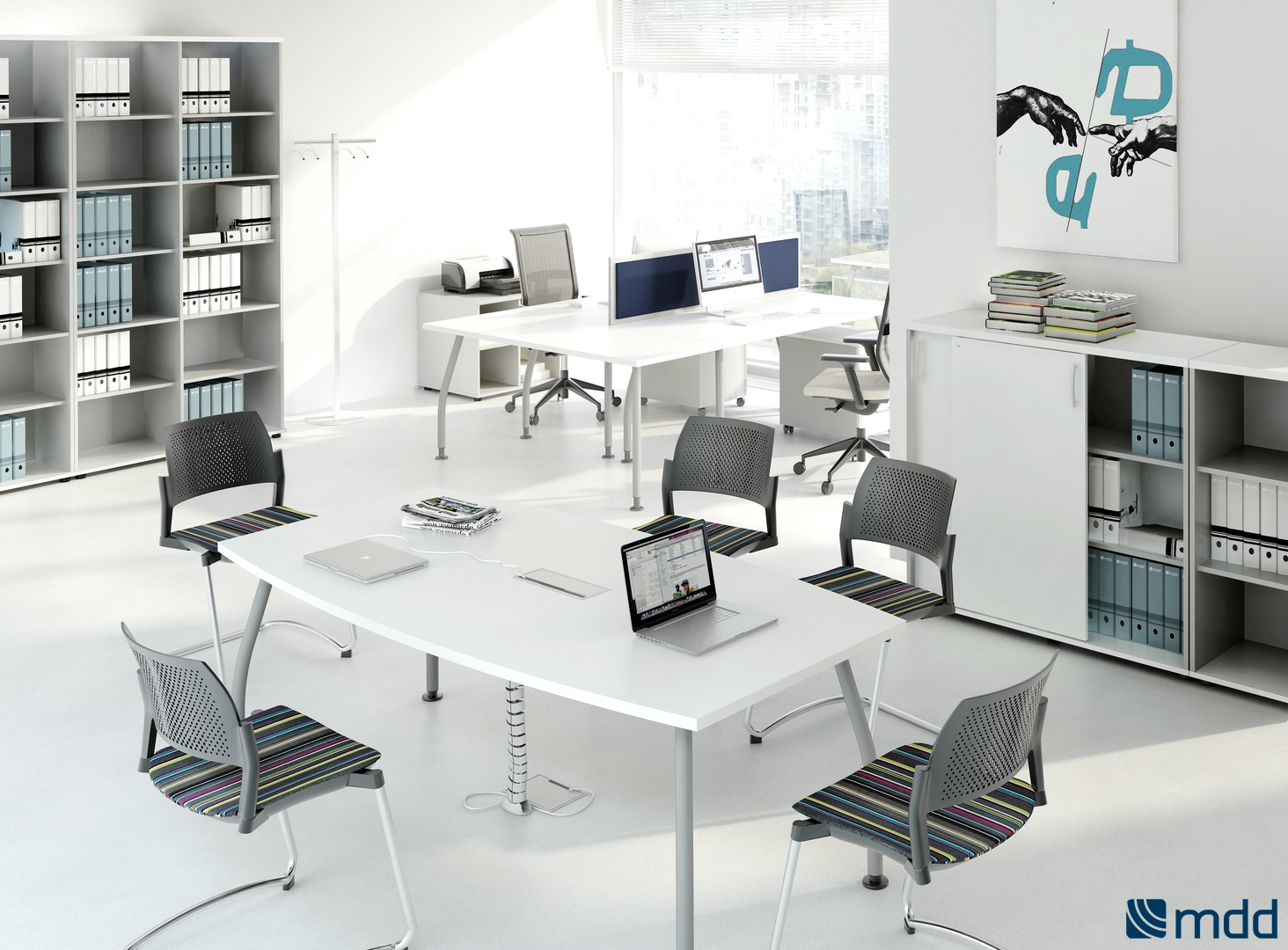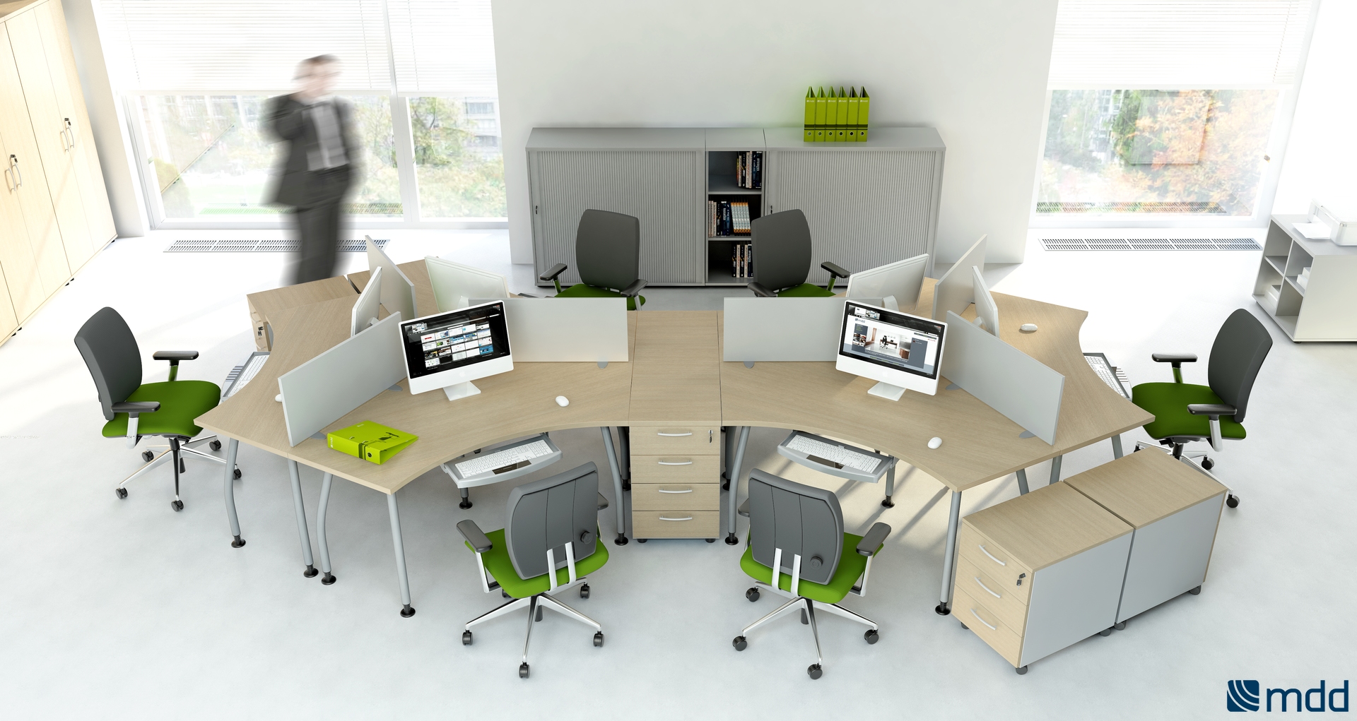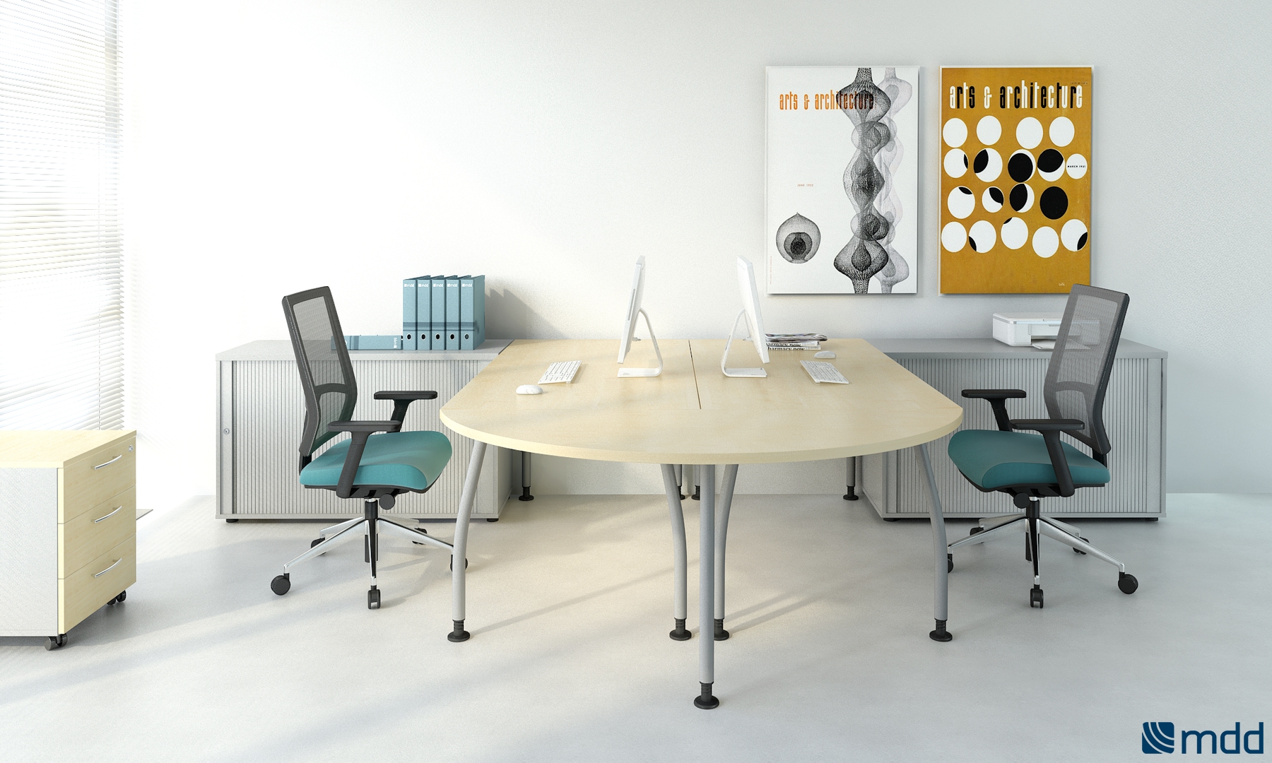 Meble biurowe MDD ALFA to system mebli pracowniczych oparty o lekko wygiętą nogę w kolorze aluminium lub antracytu. Lekka konstrukcja, szeroka gama biurek daje bardzo szerokie możliwości aranżacyjne biur.