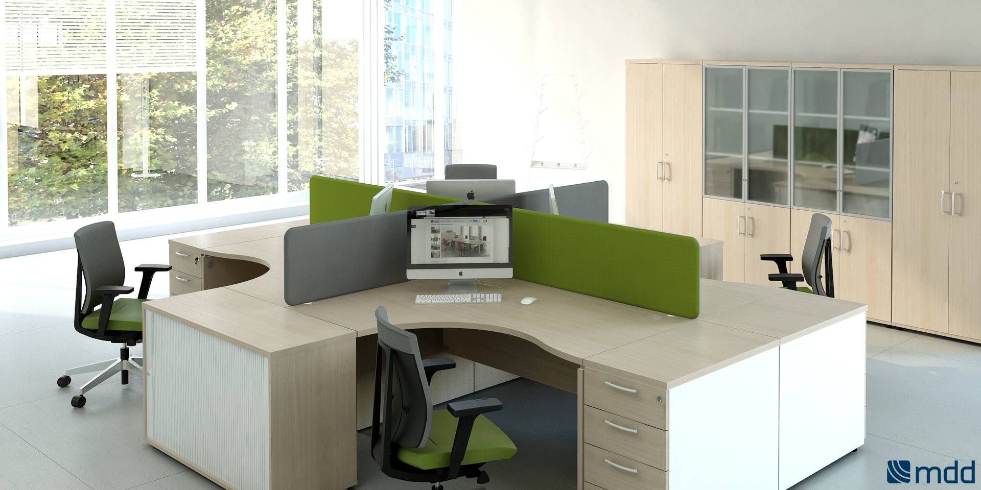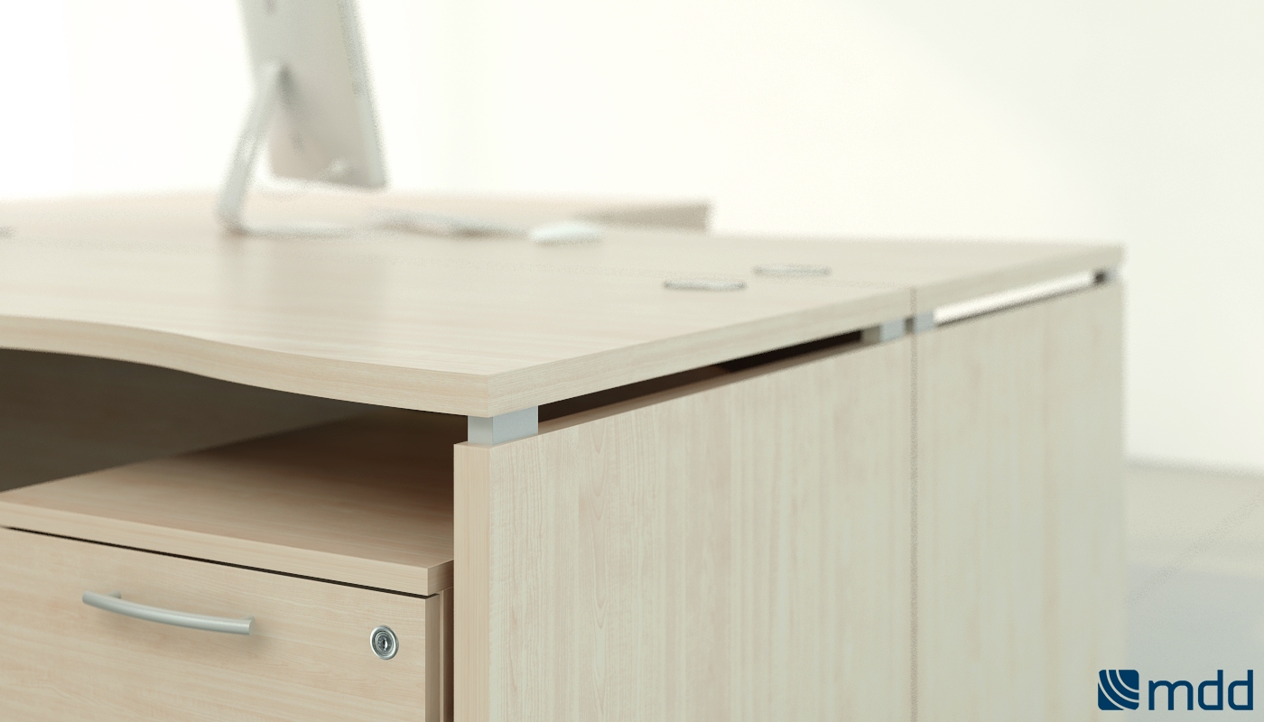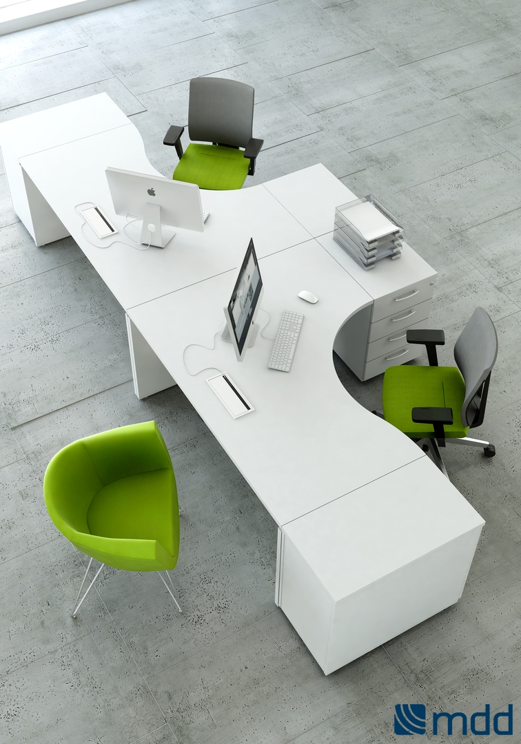Szeroka gama biurek o różnych kształtach umożliwia tworzenie pojedynczych oraz wielostanowiskowych miejsc pracy. Proste kształty mebli tworzą harmonie i ład. Pozwala to na większą koncentrację przy pracy.