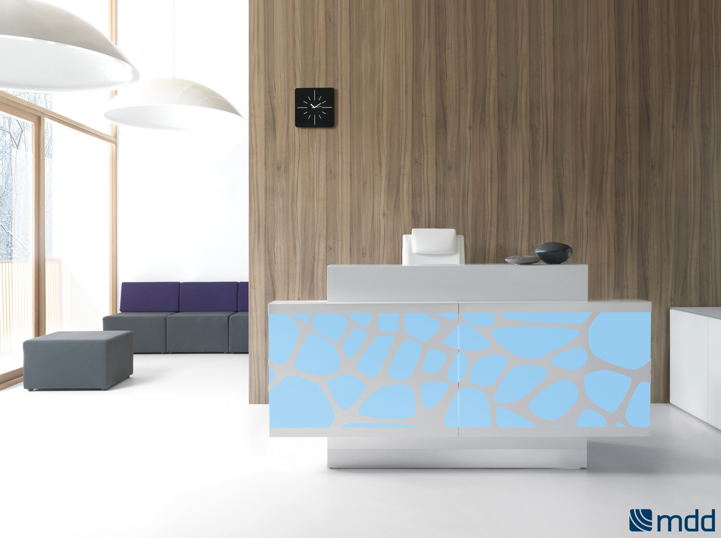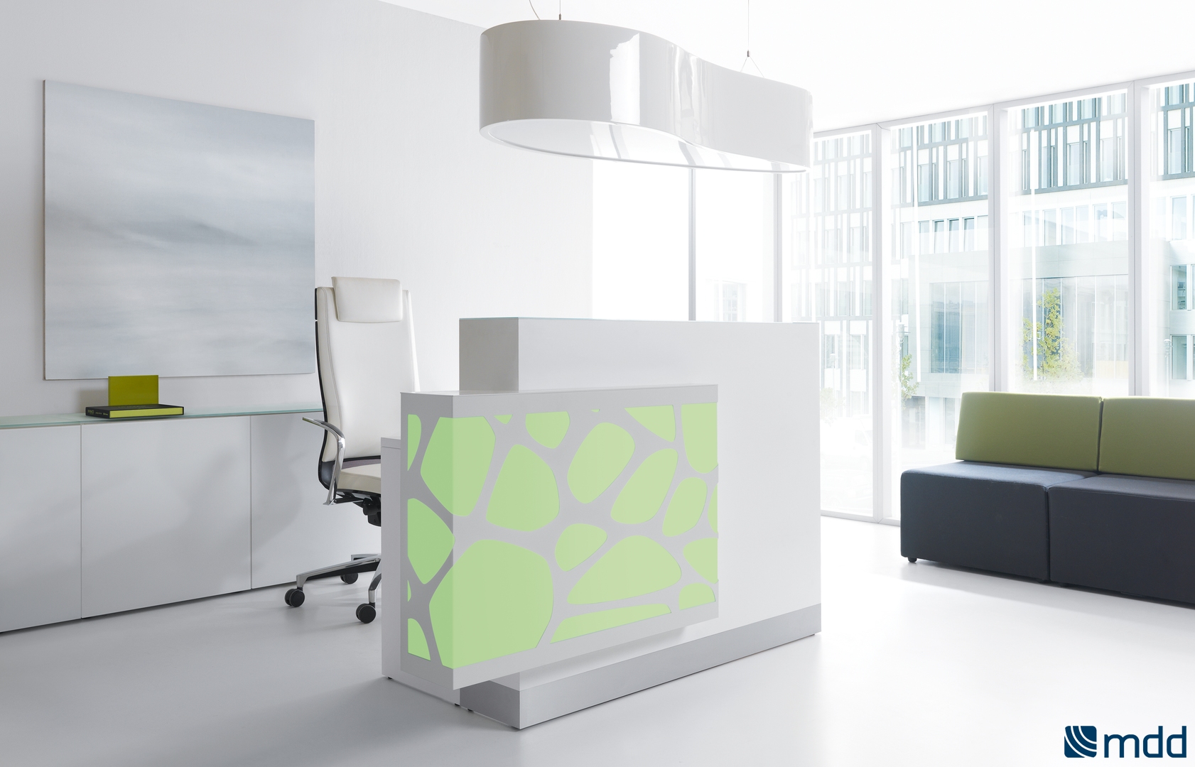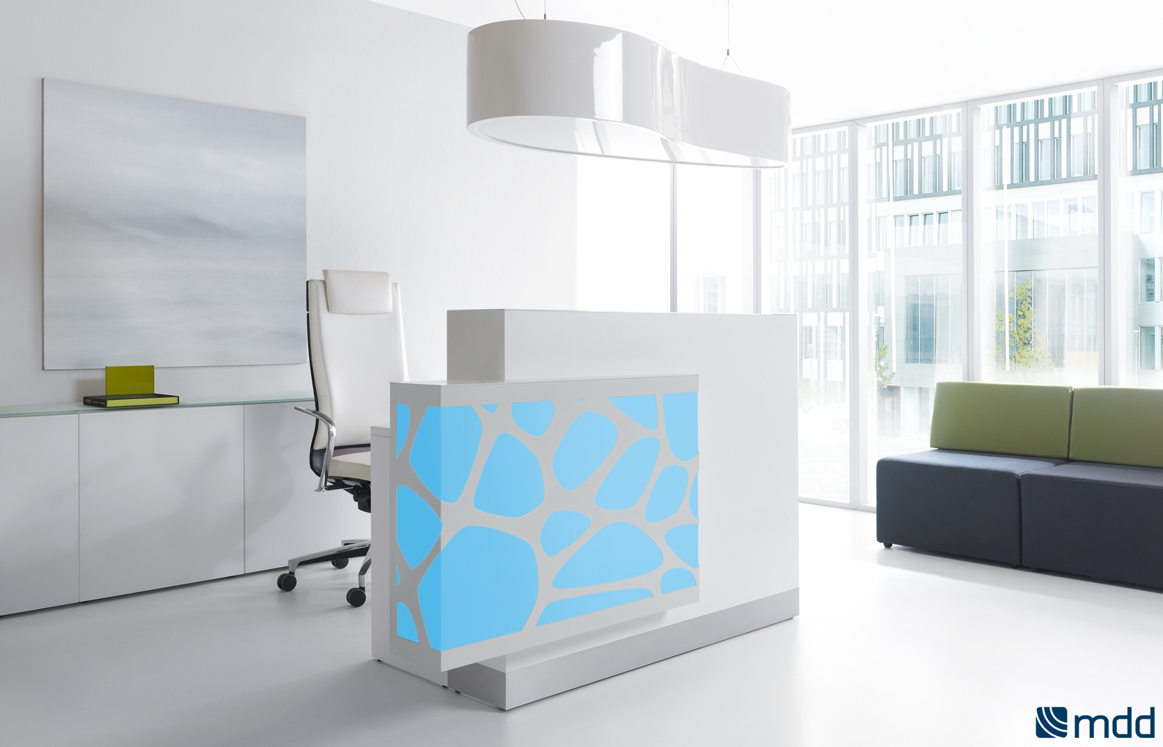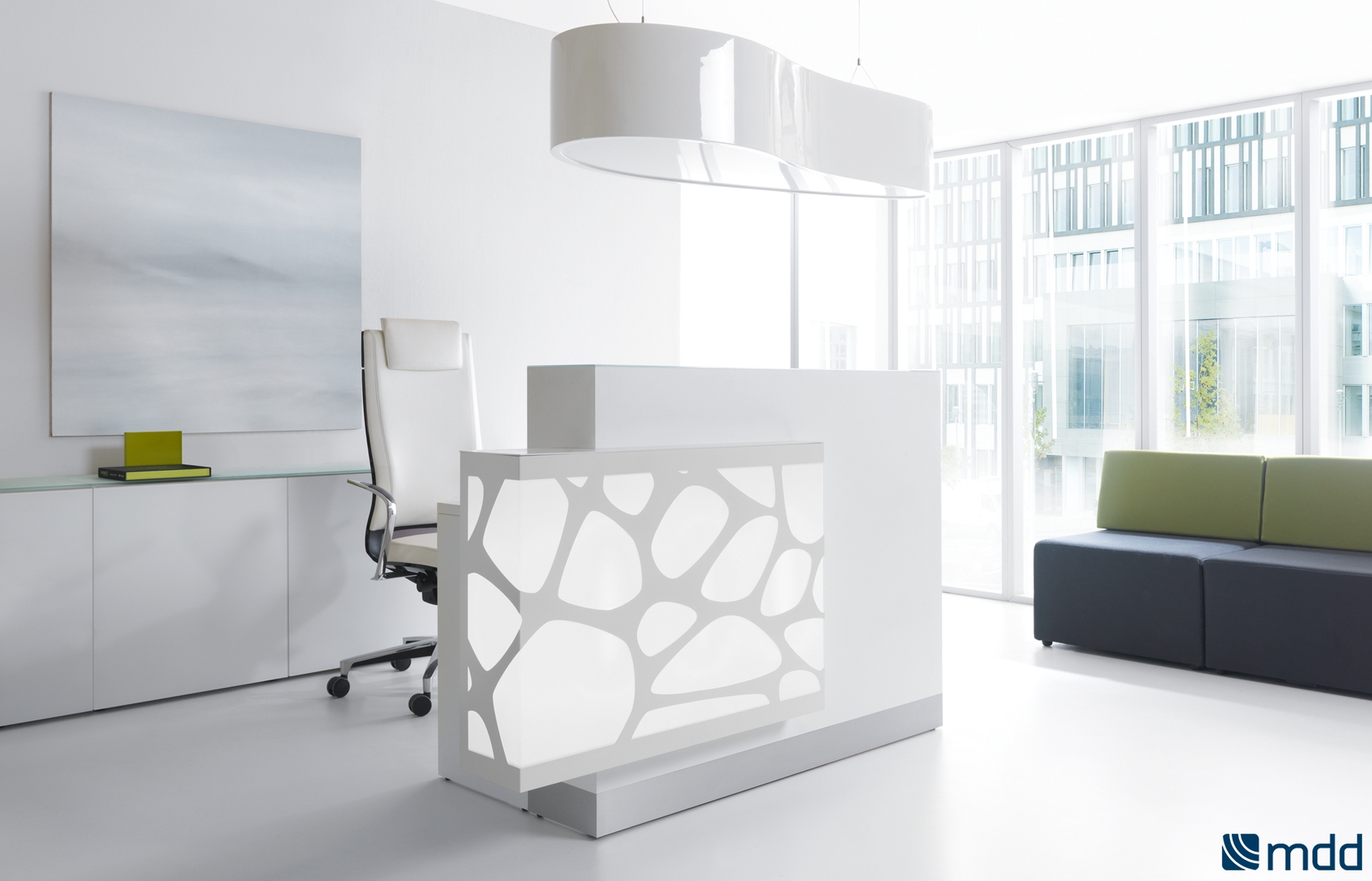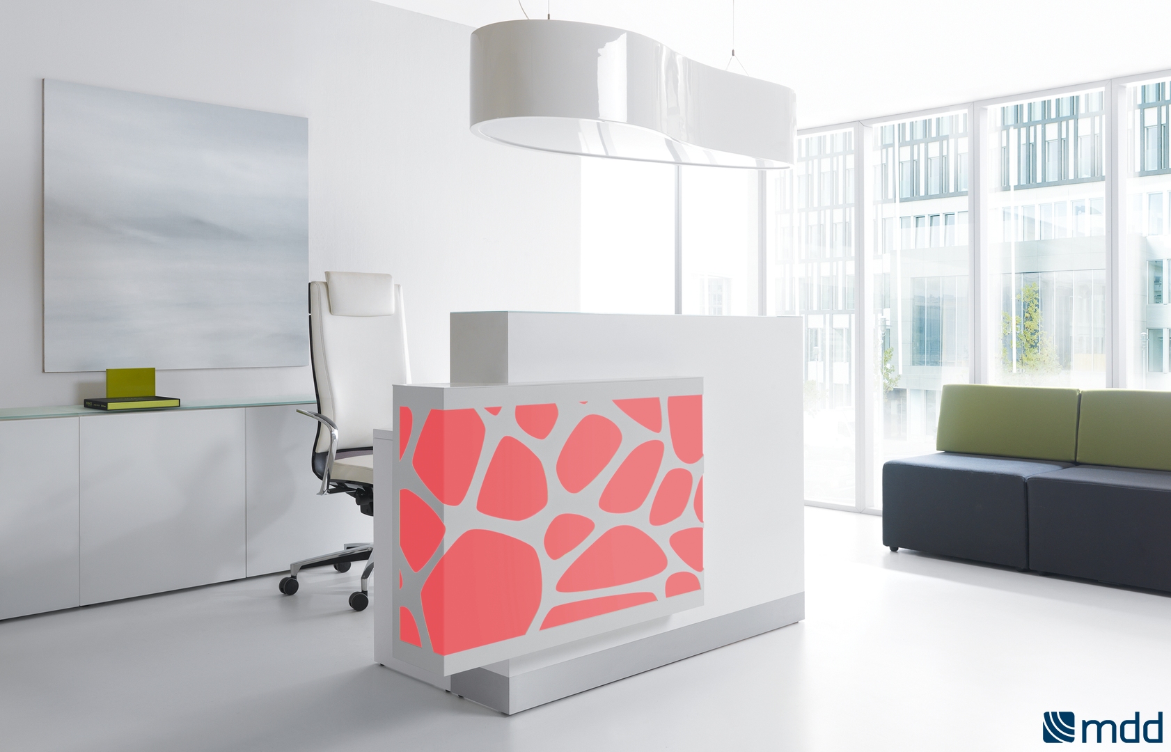Lada recepcyjna MDD ORGANIC to organiczne kształty zamknięte w kubistycznej formie. Lada czerpie swój wzór prosto z natury, by w dzisiejszym świecie chaosu zapewnić choć odrobinę odprężenia. Biały kolor nadaje ladzie świeżości i jednocześnie nie ogranicza w żaden sposób kolorystyki wystroju biura pozwalając na indywidualne pomysły. Naturalne kształty podkreśla dodatkowo jasne podświetlenie dzięki wbudowanemu systemowi jarzeniówek. Całość wykańcza szklany blat, nadając ladzie blasku i szlachetności.