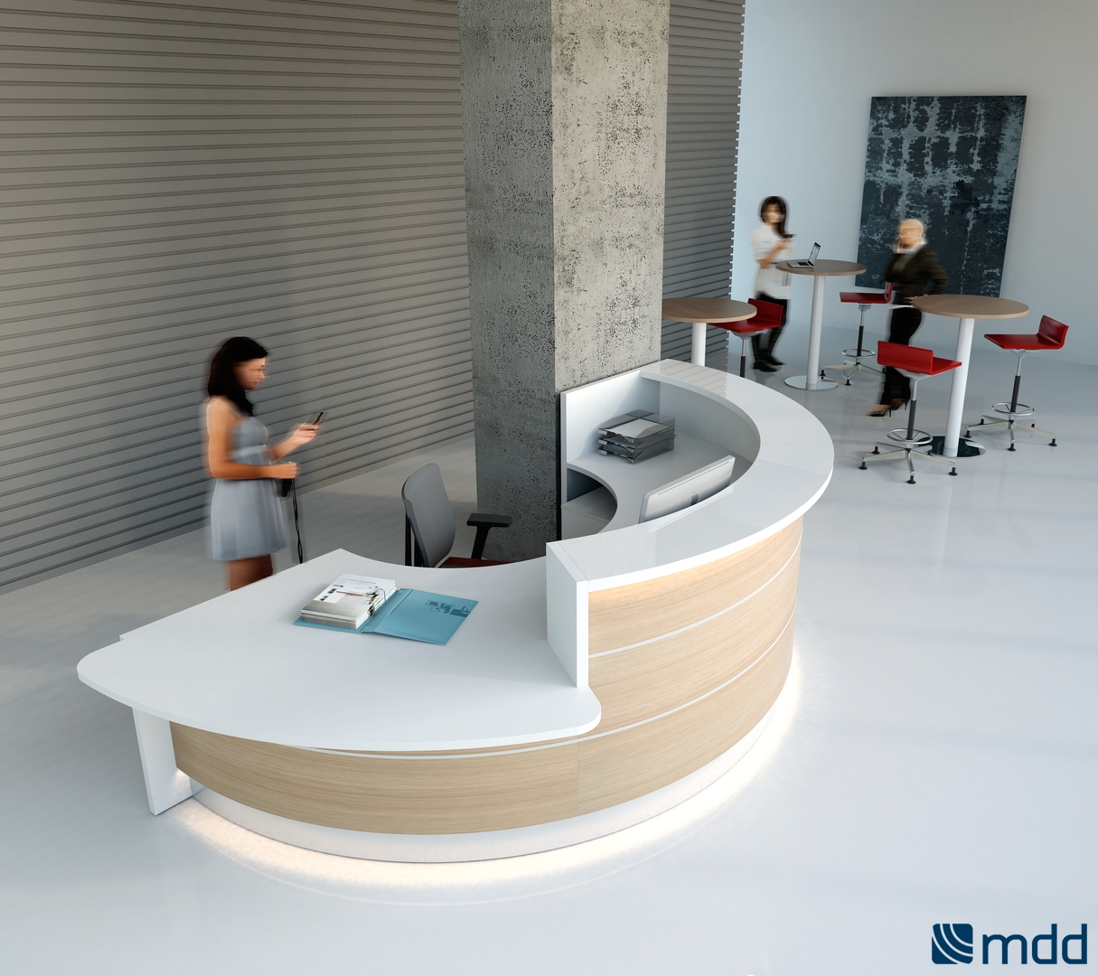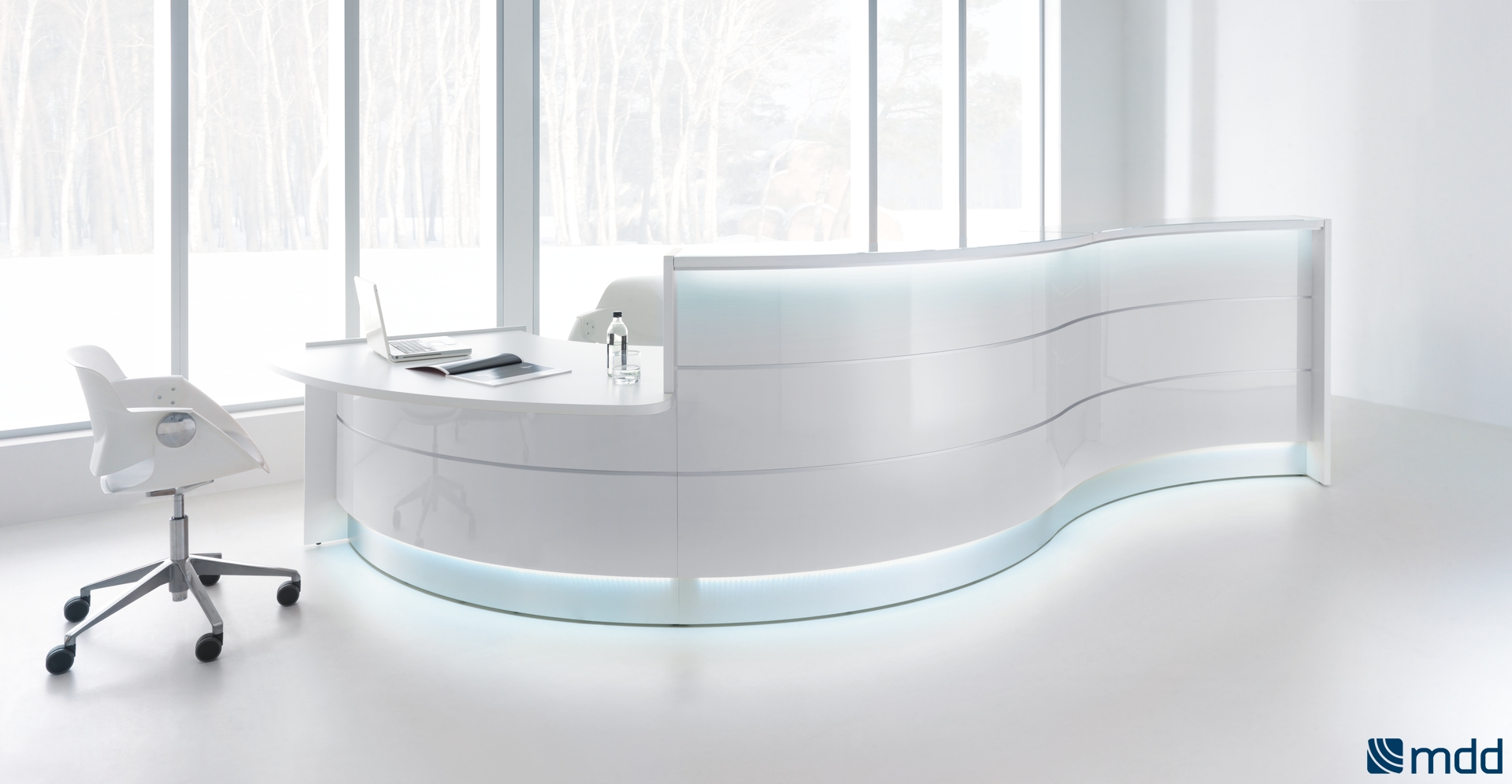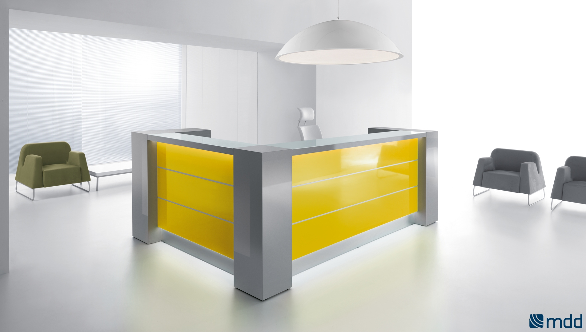 Lada recepcyjna MDD VALDE subtelna lada doskonale wpisująca się w aktualne trendy. Dzięki połączeniu szlachetnych materiałów – szkła, aluminium i kolorowych laminatów tworzy elegancką, reprezentacyjną całość. Blat z hartowanego białego szkła doskonale współgra z połyskującym frontem lady, a poziomo biegnące aluminiowe listwy delikatnie podkreślają kształt oraz nowoczesny charakter bryły.