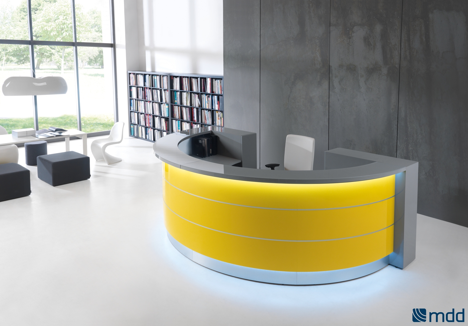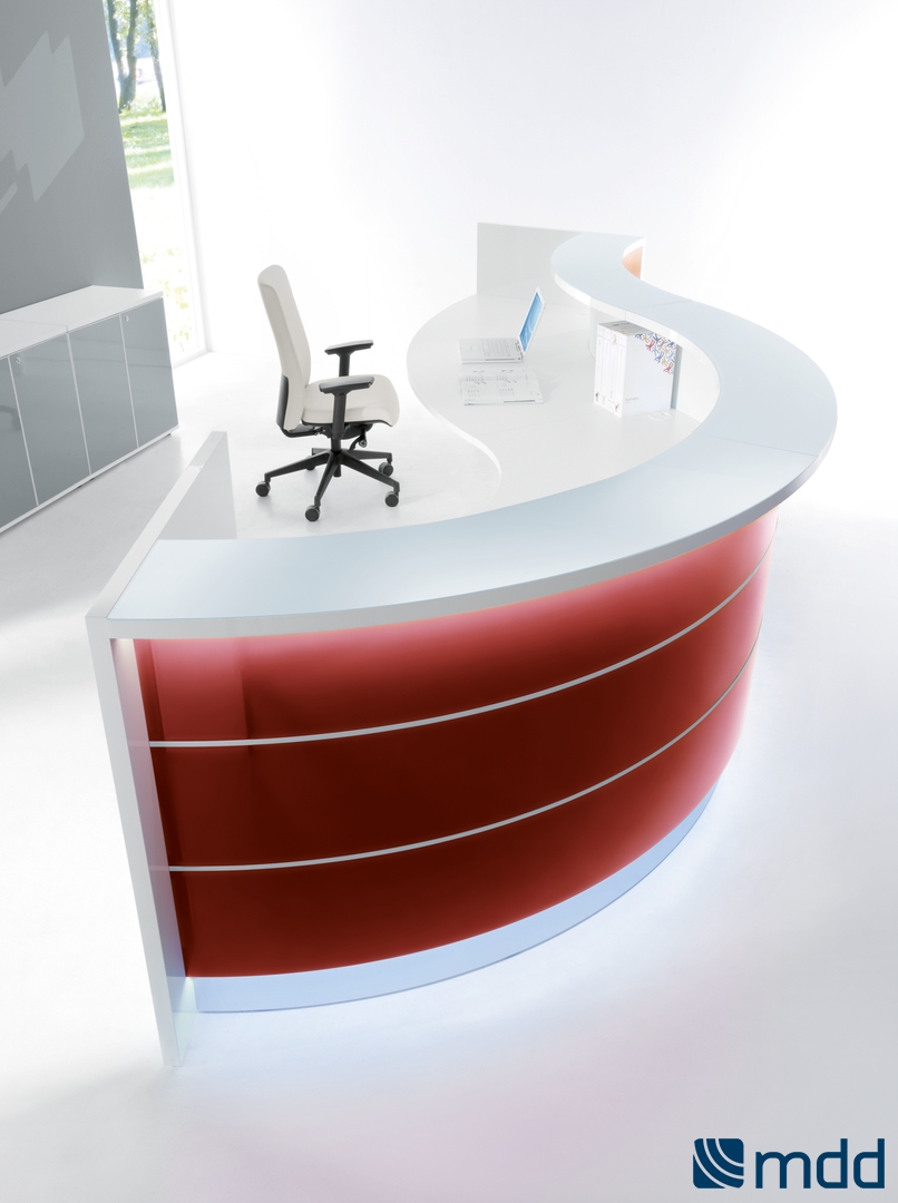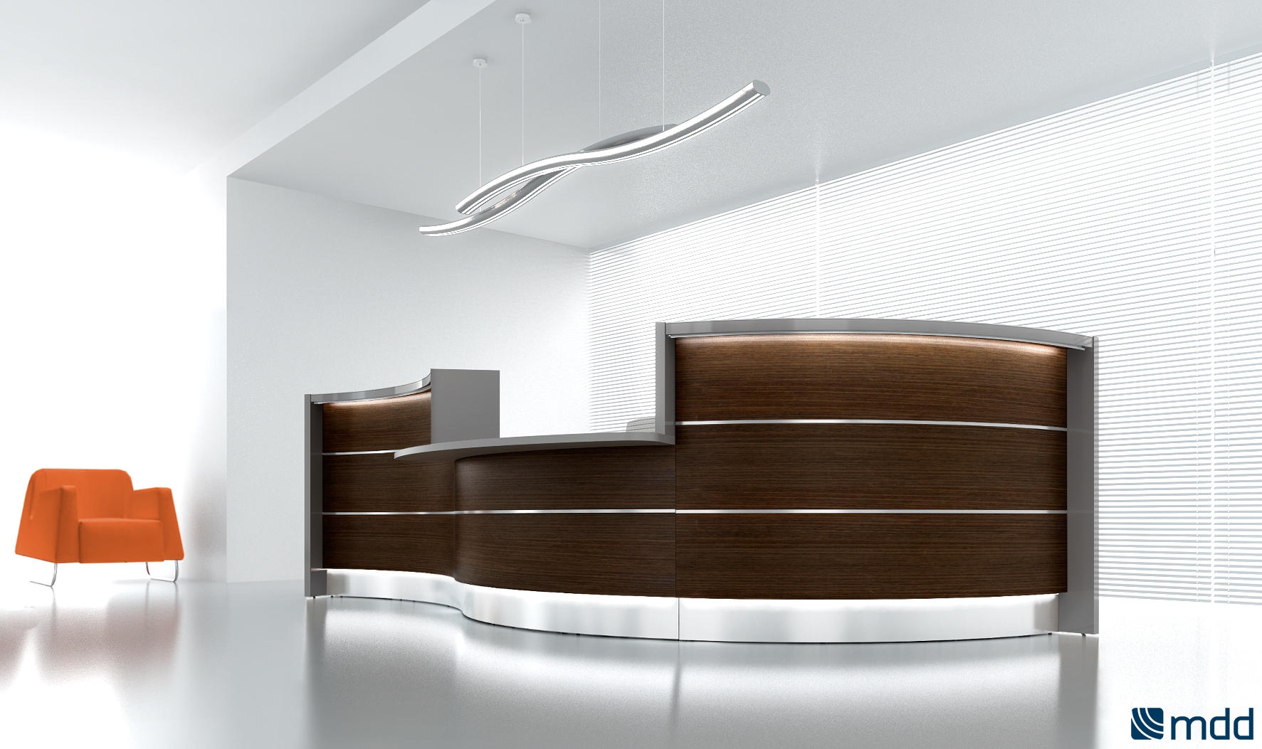 Lada recepcyjna MDD VALDE subtelna lada doskonale wpisująca się w aktualne trendy. Dzięki połączeniu szlachetnych materiałów – szkła, aluminium i kolorowych laminatów tworzy elegancką, reprezentacyjną całość. Blat z hartowanego białego szkła doskonale współgra z połyskującym frontem lady, a poziomo biegnące aluminiowe listwy delikatnie podkreślają kształt oraz nowoczesny charakter bryły.