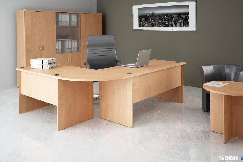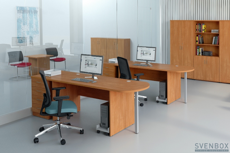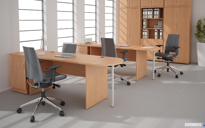 Meble biurowe SVENBOX CLASSIC EKO_C to biurka o konstrukcji płytowej, składające się ze stabilnej podstawy oraz grubego blatu zabezpieczonego obrzeżem PVC 2mm. Gwarantują wieloletnią trwałość i precyzję wykonania. Ergonomiczne biurka w połączeniu z kontenerami tworzą funkcjonalną powierzchnię do pracy. Różnorodność wymiarów i kształtów blatów w połączeniu z prostotą i funkcjonalnością pozwala na dowolną aranżację zarówno małych, jak i większych pomieszczeń biurowych.
