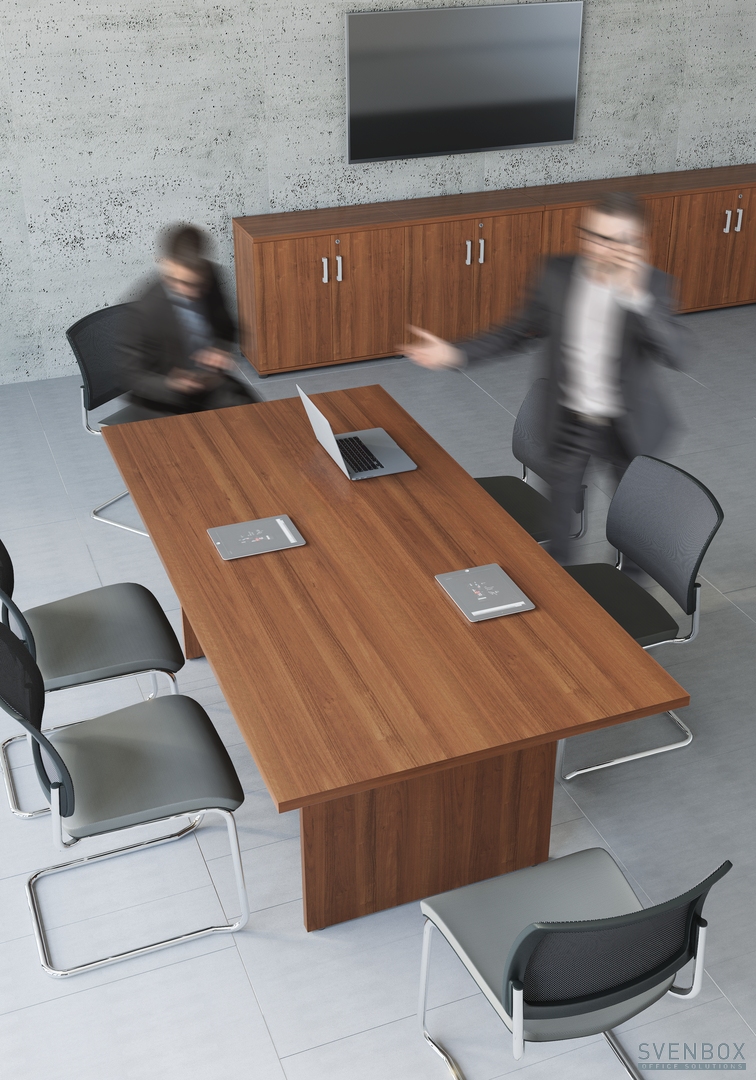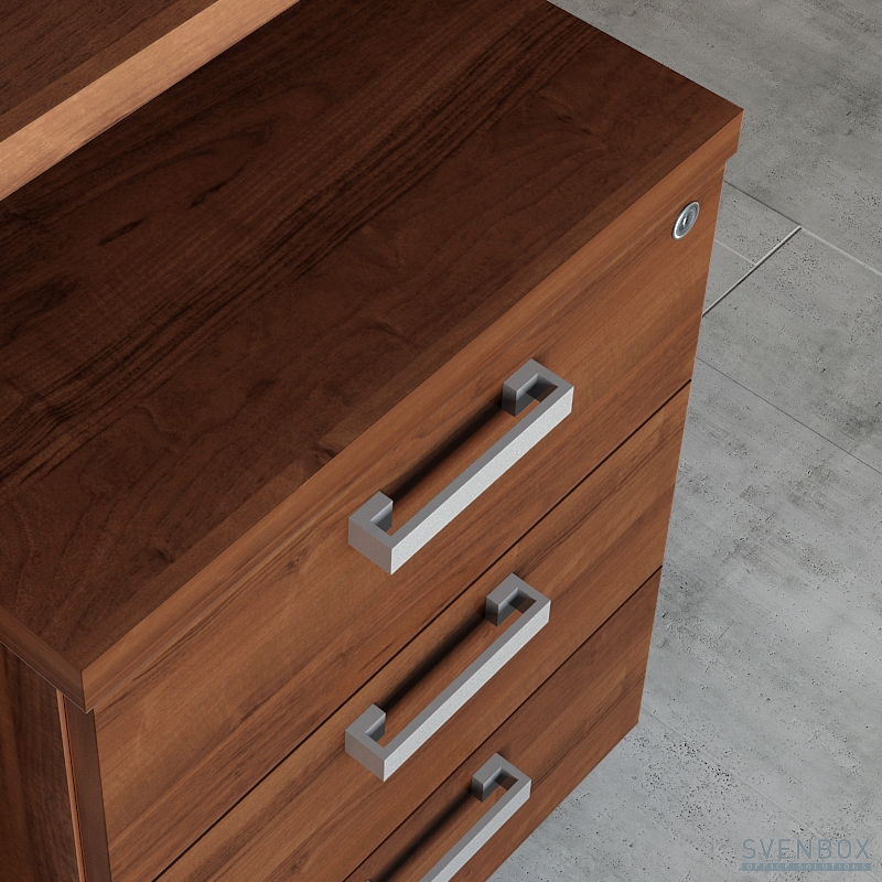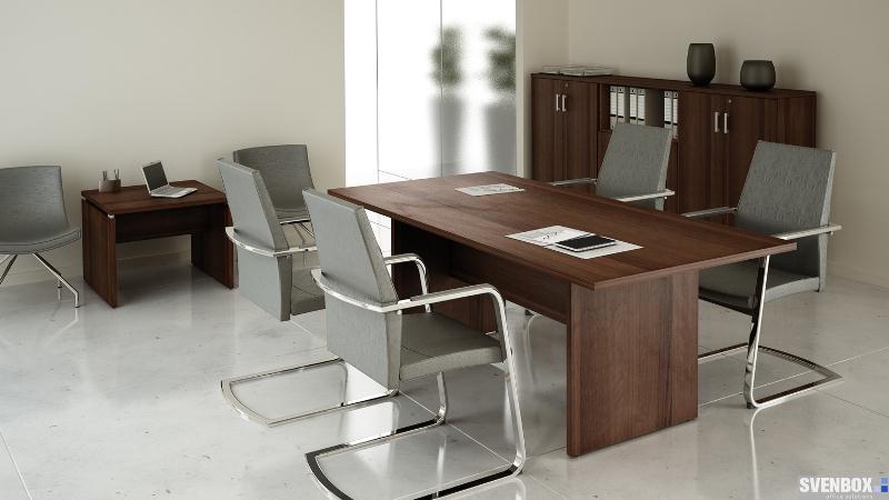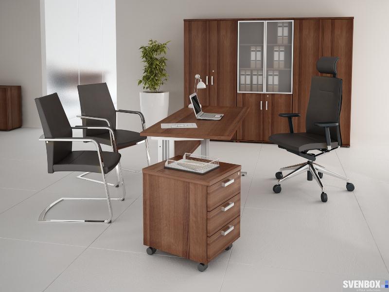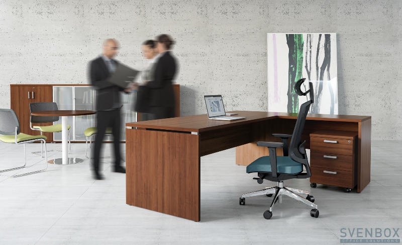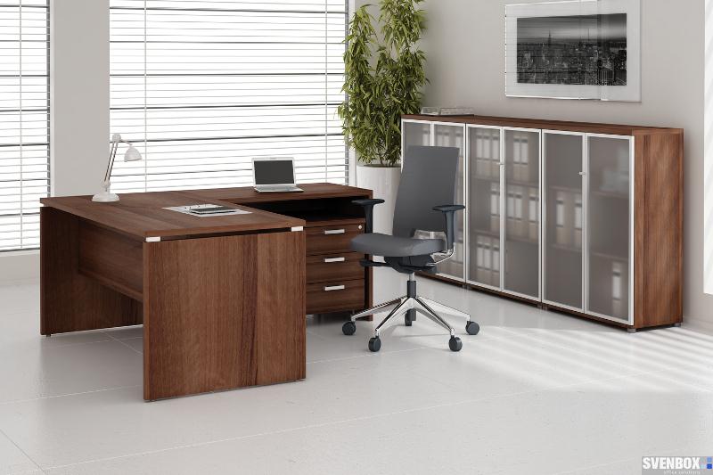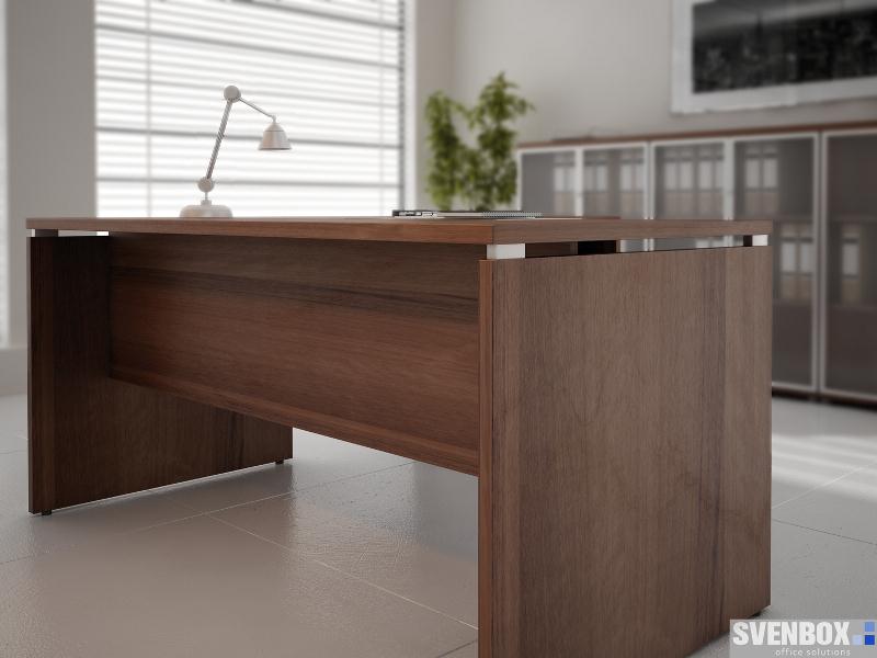 Meble biurowe SVENBOX ECHO to propozycja tzw. mebli gabinetowych klasycznych w formie i kolorze orzecha nizinnego. Charakterystyczny element aluminiowego dystansu, występujący w biurku i stoliku kawowym, wzmacnia efekt świeżości i lekkości całego zestawu.