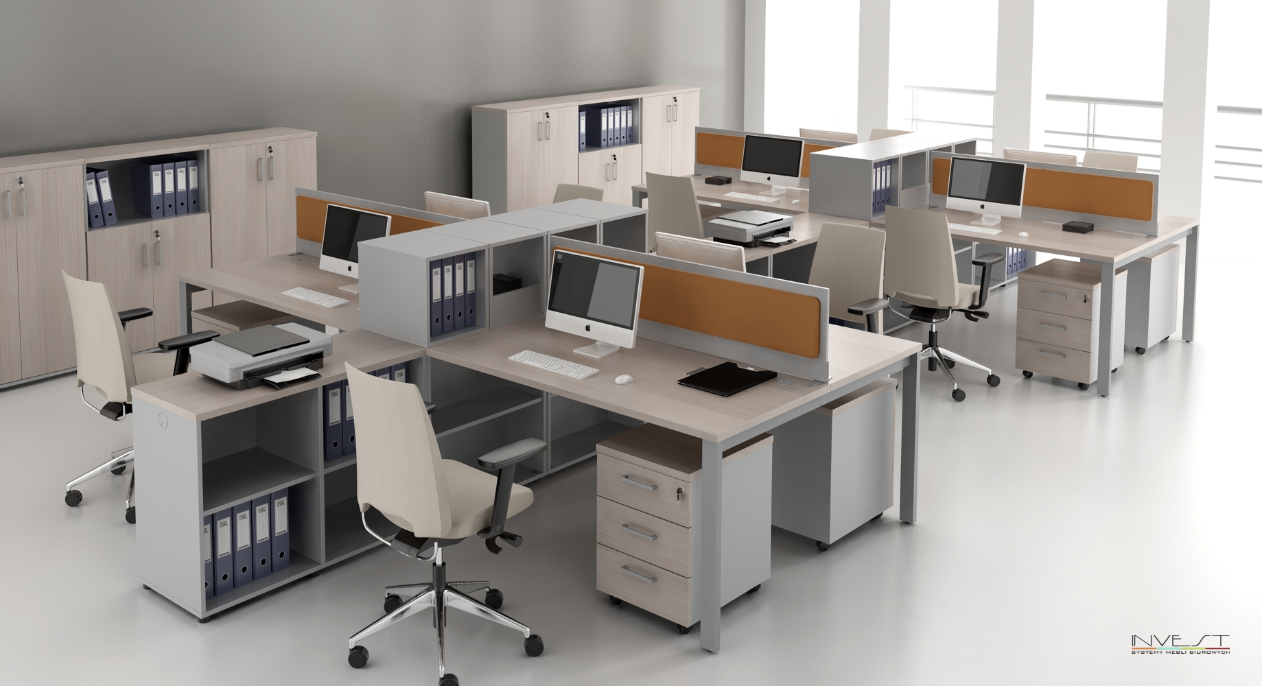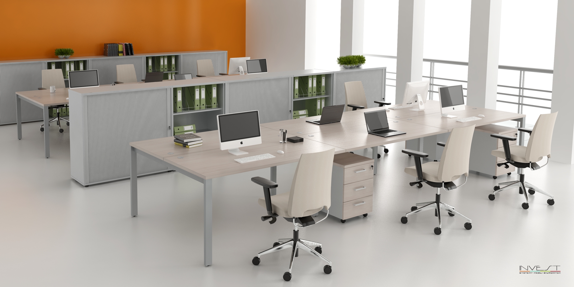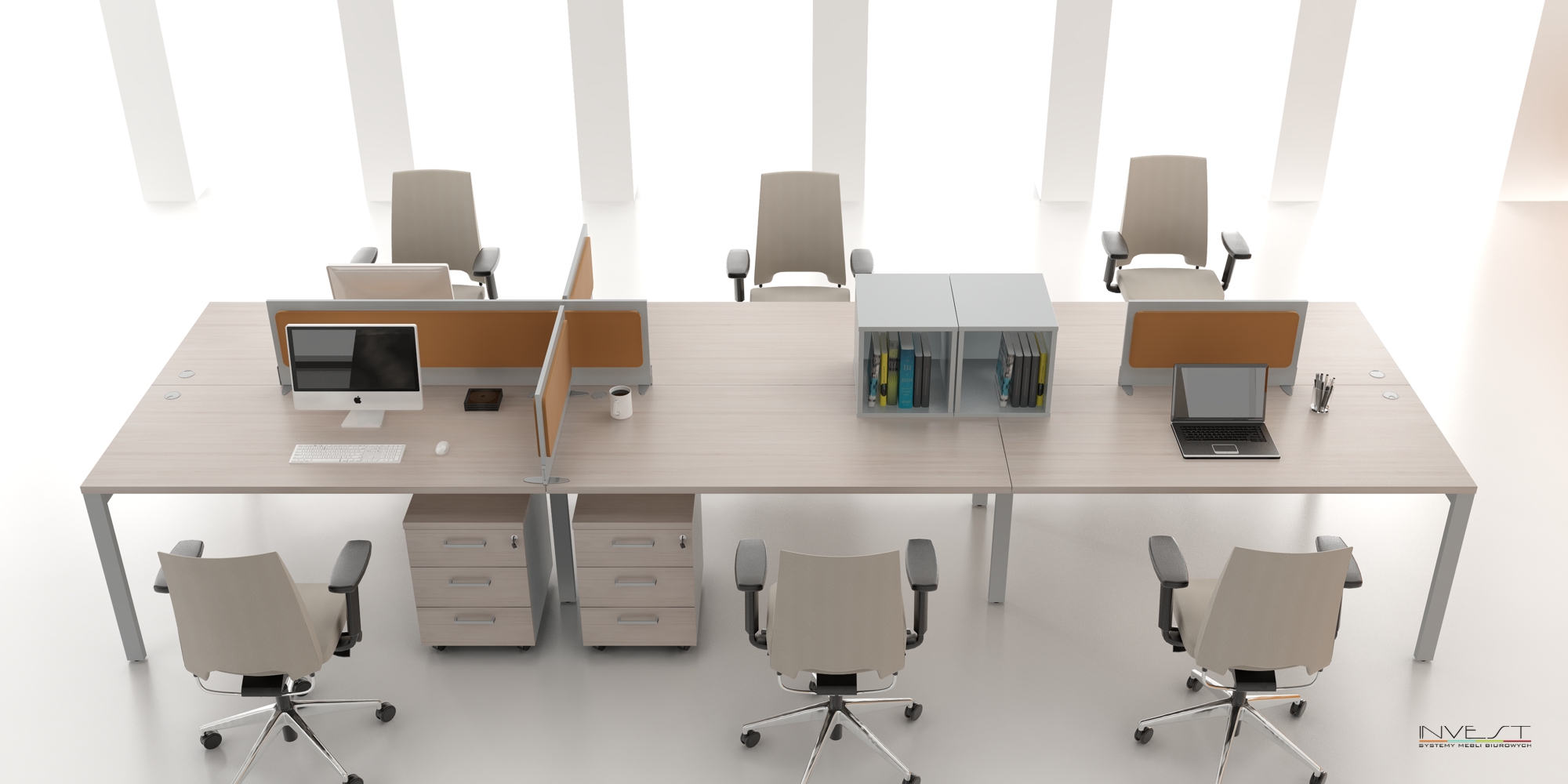 System mebli pracowniczych opartych o metalowy stelaż, dzięki któremu można tworzyć dowolne konfiguracje miejsc pracy.