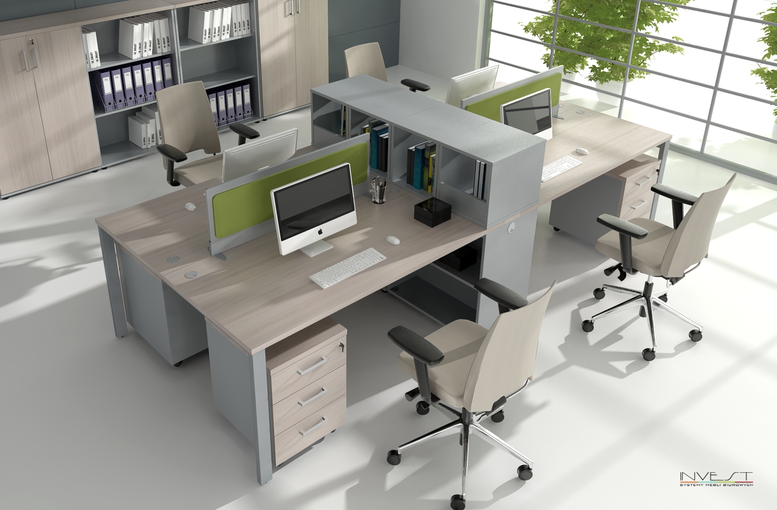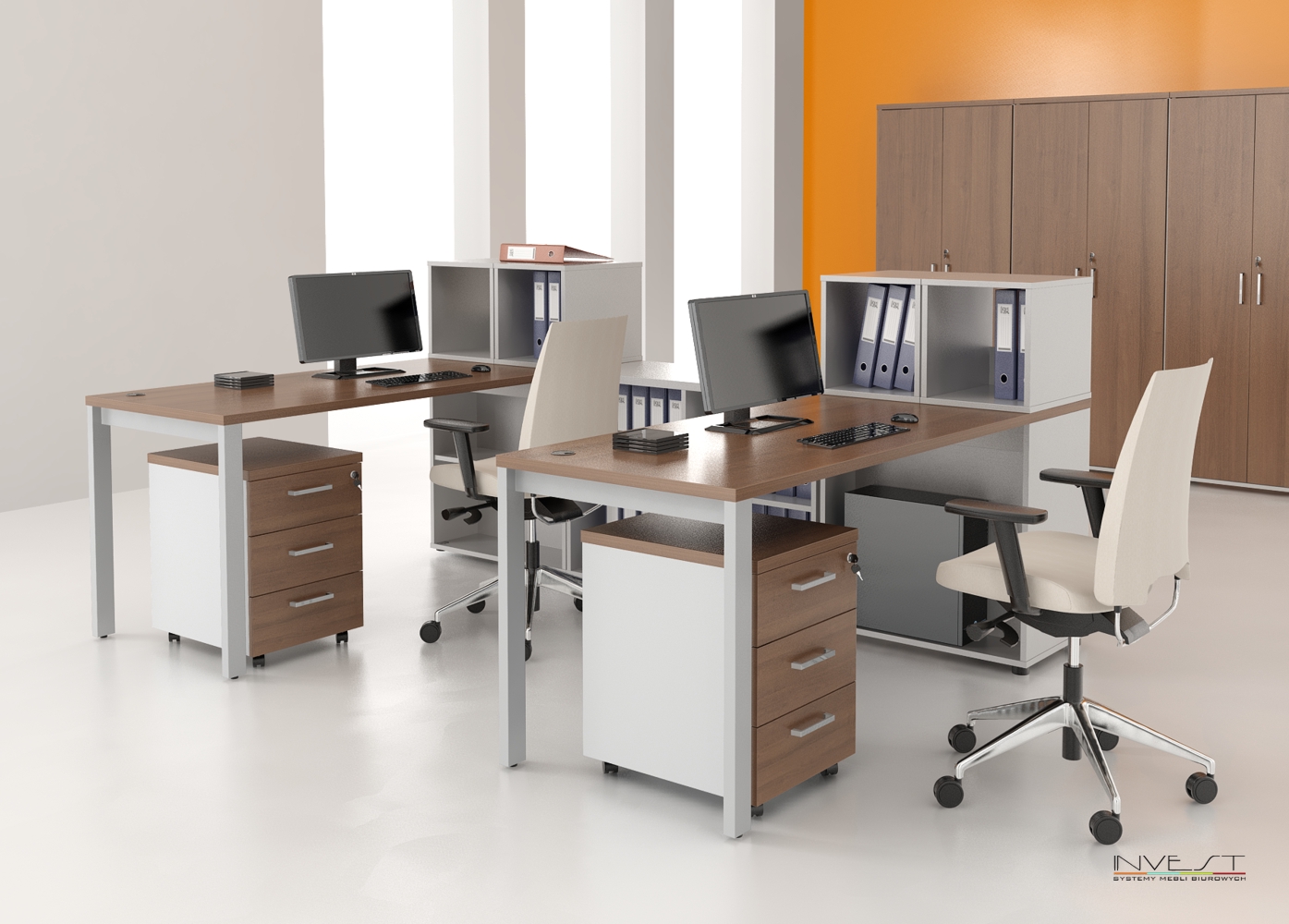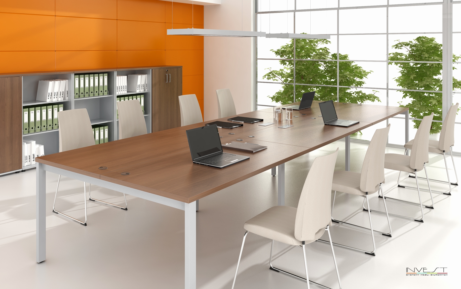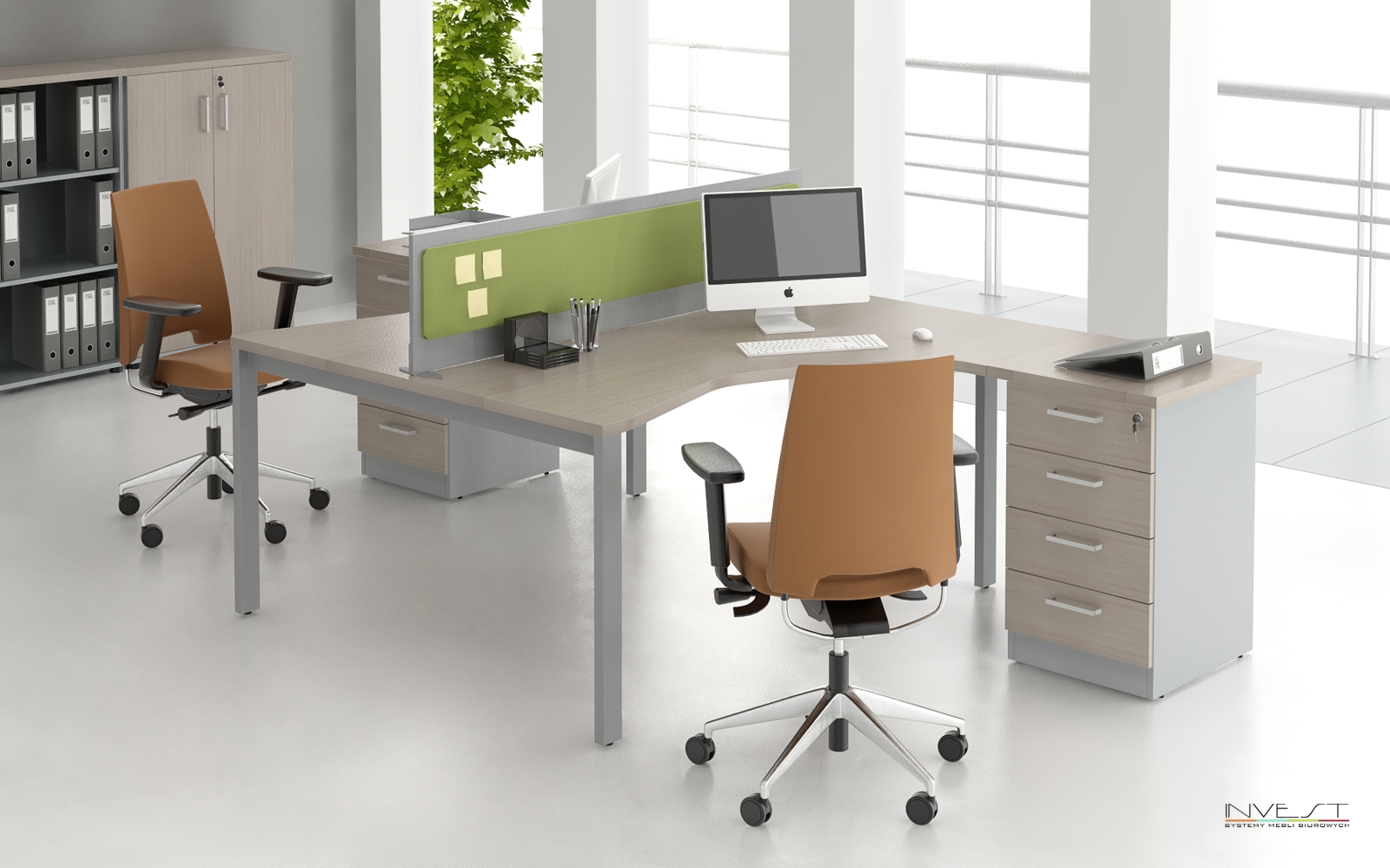 System mebli pracowniczych opartych o metalowy stelaż, dzięki któremu można tworzyć dowolne konfiguracje miejsc pracy.